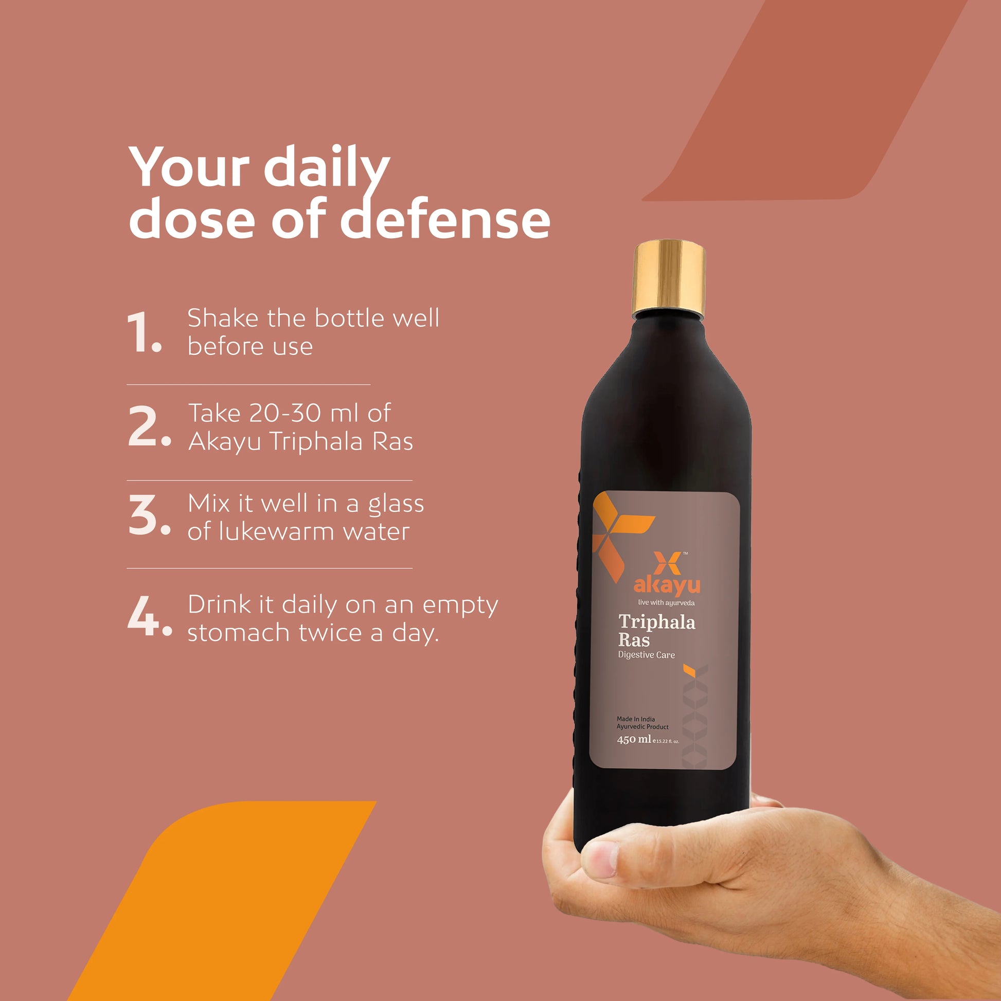 Take 15-30 ml of Akayu Triphala Ras with a glass of water, preferably on an empty stomach every morning. For best results, use consistently or as prescribed by the physician.
